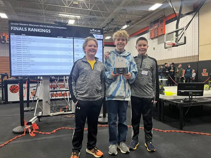 The Spartan Robotics team Triple Threat, consisting of St. Joseph fifth graders Max Delf, Zac Haughain, and Eli Helgeson, was awarded the Elementary Level Excellence Award for their outstanding performance throughout the day. In the middle school category, Spartan Robotics team Ctrl-Z, made up of Michael Peterson, Jacob Charron, and Addie Pacholke, won the Middle School Excellence Award, recognizing the best overall performance in their division. They also won the skills competition, outscoring the next best team by over 20 points.
